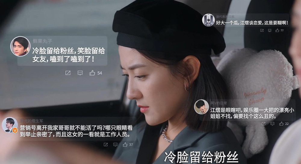 在恋情被拍,明明没有什么亲密的动作,但全靠一张图编故事后,余声声的生活陷入很大的风波,工作被影响暂时休息,被较为极端的粉丝谩骂,人身攻击,甚至还被人肉,在当时两人为了避嫌没有见面煲着电话粥,两人开着视频互相安慰看对方睡觉,江熠就这么看了很久很久,剧情虽虐但甜,又磕到了。不过虽然代入观众的视角,被这两人的恋爱甜到、虐到,但是如果稍微代入一下粉丝视角,真心是分分钟心梗,冷脸留给粉丝,笑脸留给女友……