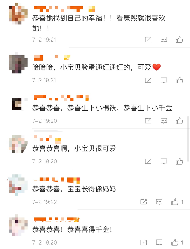 如今,见到她成功升级为母亲,网友们纷纷感慨“时代的眼泪”并送来了祝福:“恭喜恭喜,恭喜生下小棉袄,恭喜生下小千金”......