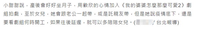 小甜甜还开心地表示,产后自己会好好地坐月子,然后再用欢欣的心情加入《我的婆婆怎么那么可爱2》的剧组拍摄。至于女儿,她会尽量多陪陪她,和老公一起亲自带,实在不行就只能委托亲友帮忙带。