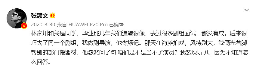 最困难的那几年,张颂文甚至怀疑过自己当不成演员了。2020年电视剧《远方的山楂树》大爆,昔日的难兄难弟林家川一战成名,张颂文不无感慨地发文,称林家川当初问过自己这个问题,自己竟无言以对: