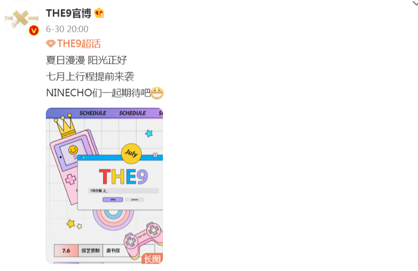 那现在能期望的就是,THE9的妹妹们在还有几个月的团体时间中多多合体了,团粉们都是这么想的了。可是结果让人失望!在6月30日,THE9官博晒出THE9的七月行程,其中根本没有任何团体安排。