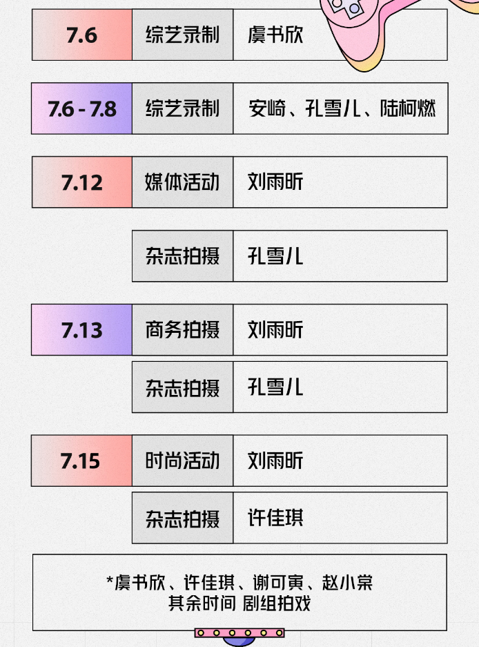 我们来看看这一张七月上半月的行程表吧,在这张行程表中,虞书欣,刘雨昕,孔雪儿等成员的名字都出现了,可唯独没有出现THE9的字眼!