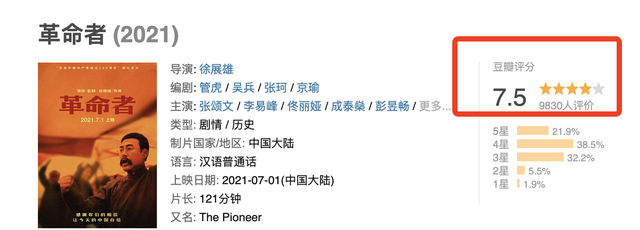 截止到7月2日晚间,豆瓣开分7.5分,李易峰、张颂文、秦昊、佟丽娅等人联手闹革命,这组王炸组合,收获满眼泪水的同时,还有更多肯定和致敬。