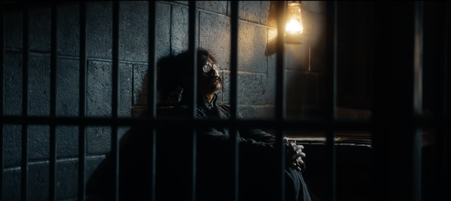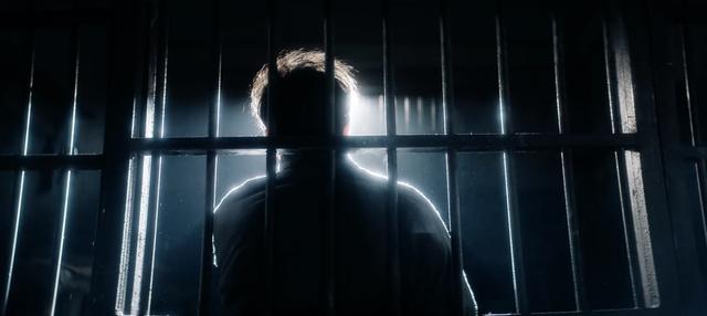 随后大雨磅礴,一幢只有昏暗灯光的监狱,冷色调色彩氛围一股悲凉充斥着整个空间,有点电影《八佰》的画面震撼感。