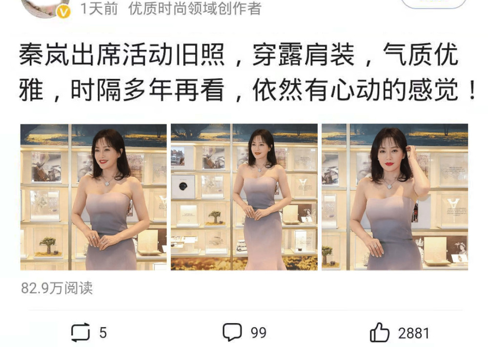 7月1日,有一位网友在网上晒出了一组秦岚穿露肩装出席活动的旧照,并配文“秦岚出席活动旧照,穿露肩装,气质优雅,时隔多年再看,依然有心动的感觉”,短短一天的时间,阅读量就将近100万了,由此可见,秦岚的穿露肩装出席活动的旧照火了。
