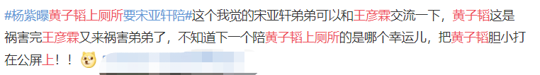 在最新一期的节目当中,在场的嘉宾需要根据线索中的“病症”来判断分别是谁的,那英确定“胡言乱语”是黄子韬的,随后杨紫表示找人陪着上厕所也是黄子韬,随后的发展就有趣了。先是黄子韬表示那这样这些都是符合自己的了,随后那英和杨紫battle了一下上厕所找人陪的问题。那英觉得黄子韬是一个大男人,怎么会上厕所让人陪呢?的确,那英说的话在理。在学生时代的时候就见到女生会结伴去洗手间,但如果是两个男生一起去,那么画面就十分微妙了。随后杨紫反驳表示自己看见黄子韬让宋亚轩陪着去上洗手间。之后黄子韬解释是看着宋亚轩没事儿才拉他的。