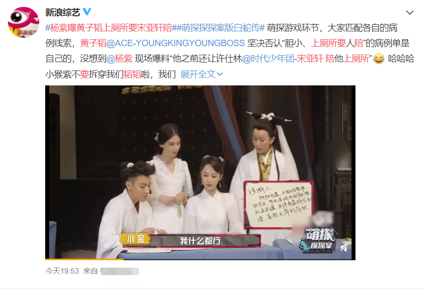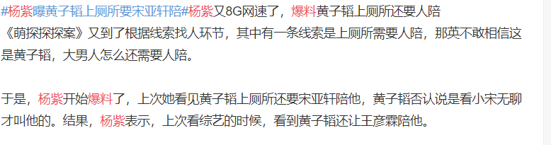 7月2日,一条“杨紫曝光黄子韬上厕所要宋亚轩陪”登上了热搜。这还是源于综艺《萌探探探案》,这档探案推理类节目刚刚上线的时候,大众还是没有那么高期待的。但是这档节目的阵容还是很强的,有着孙红雷大哥,还有综艺新星那英的加入,黄子韬和杨紫,还有杨迪三个人综艺感都是满分,最后还有宋亚轩。