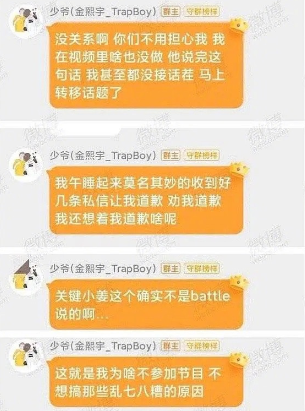 姜云升的道歉文中,提到自己翻车视频中的发言,是圈外人理解不了的fs以及韵的概念。结果视频中和姜云升连麦的另一个rapper金熙宇,却在自己的粉丝群里称,自己当时并不是在跟他battle。对于让自己道歉的话,他则表示自己没有接姜云升的茬,并且转移了话题。