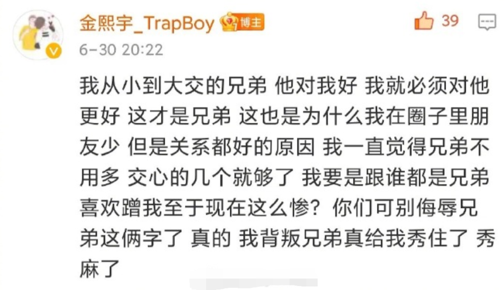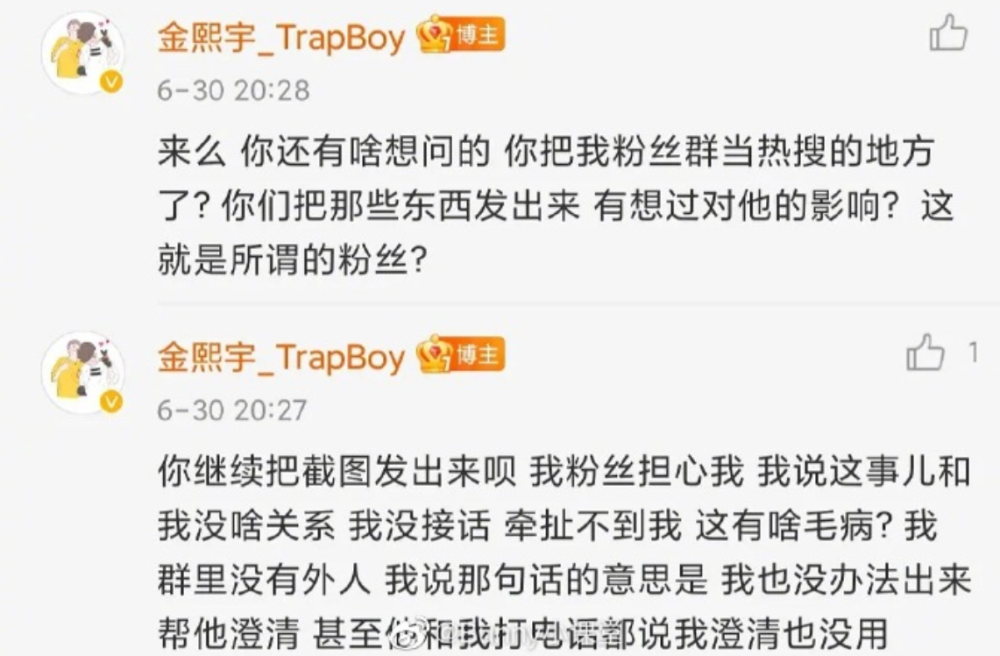 这也是很尴尬了,而这个内容也导致金熙宇被一些网友大骂背后插兄弟一刀,想红想疯了。这下子金熙宇就坐不住了,先是怒斥把粉丝群内容公开的人用心不良,同时称有的人断章取义,而自己在微博上也被人攻击了。