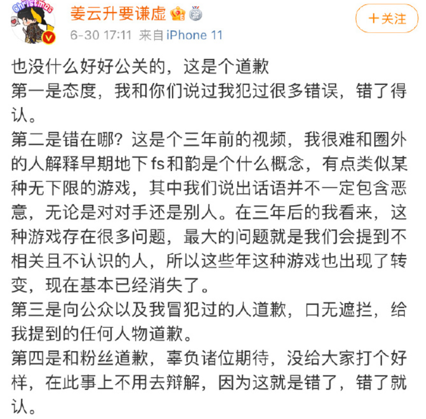 这件事情发生后,姜云升倒是很快就发文道歉了,态度倒也诚恳,表示没有什么好公关的,还坦言自己早就说过,以前犯过很多错,自己不会不承认,还表示虽然视频里那样的游戏,不一定带着恶意,但却是很不好。