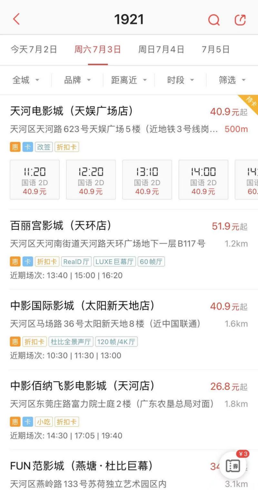 7月2日晚,记者看到在猫眼和淘票票等购票平台上,广州市天河区影院已陆续开始排片售票。部分影院也通过社交网络公布了复工喜讯。
