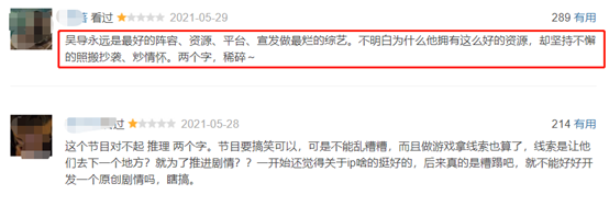煽情不是不好,也没必要每个节目都来这一套。煽 情在专注高效的综艺里面可以引人深省,在探案类的综艺里面就显得有些不伦不类了。在类型不同的综艺节目里,竟然用上了多个相同套路,吴彤这操作简直太骚了。