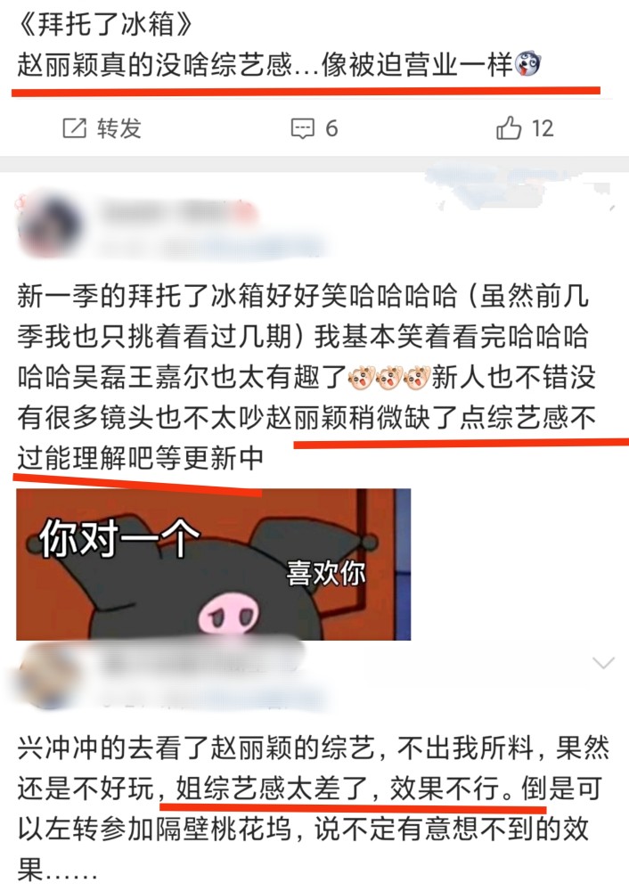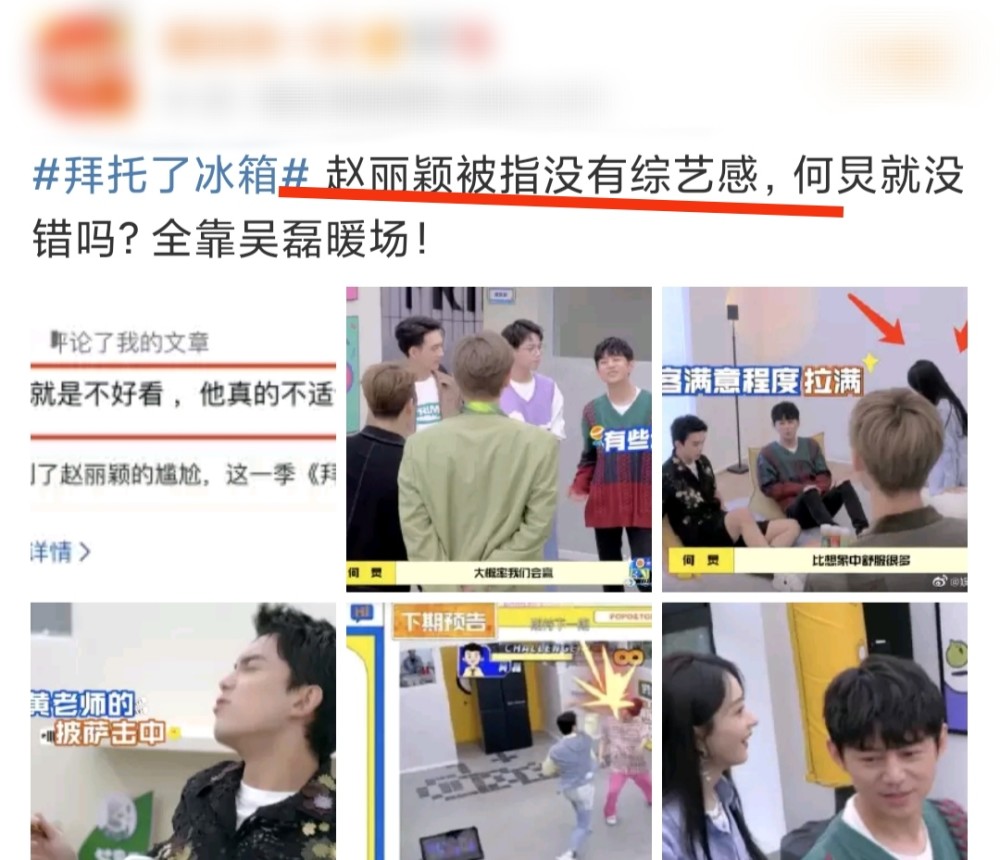 如图所示,在两期《拜托了冰箱》播出之后,一些营销号下场质疑赵丽颖没有综艺感,而一些观众,也理性的吐槽了赵丽颖的综艺感。