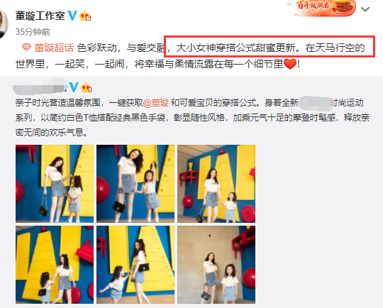 7月3日工作室转发某品牌为董璇携女儿拍摄的大片,高颜值母女上线,小酒窝时尚表现力强。