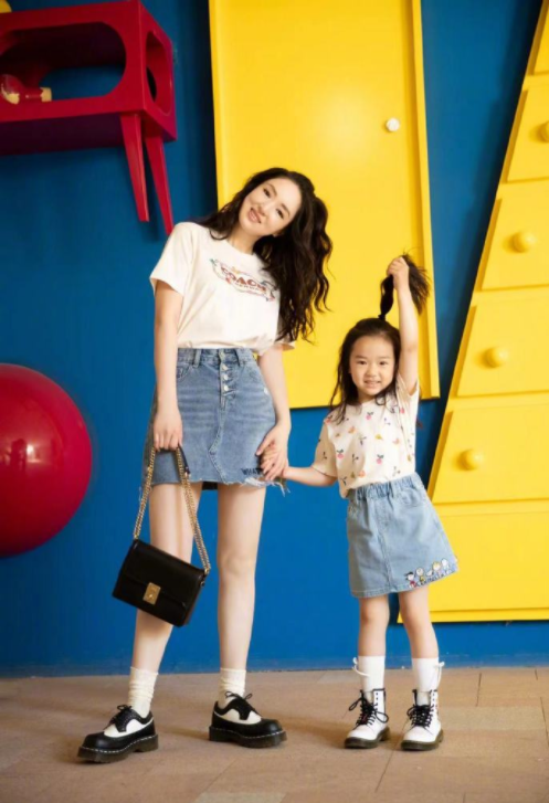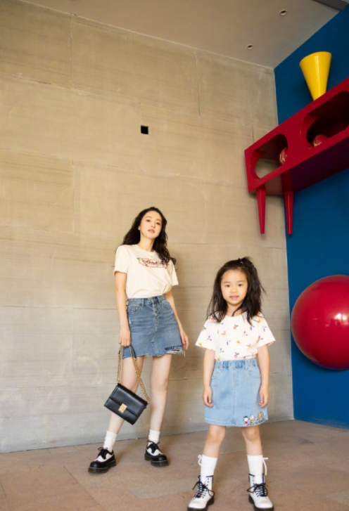 母女穿亲子装出镜,同穿白色T恤搭配牛仔裙,黑白色鞋子,看起来清爽怡人,颇有夏天的感觉。