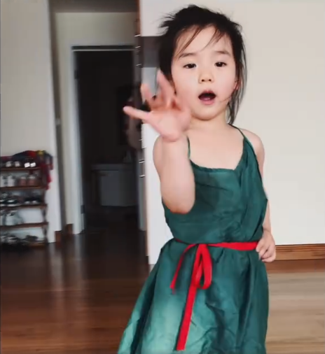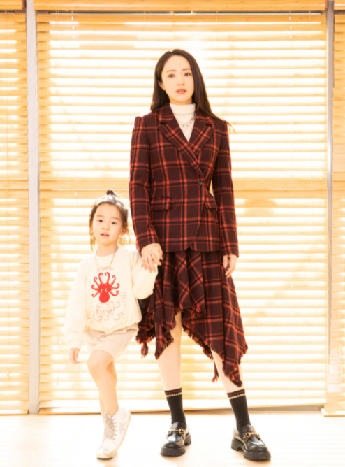 酒窝站在妈妈身前随意垂下双臂,自然摆出pose,董璇配合女儿随随便便摆个pose就能展现女星的强大气场。