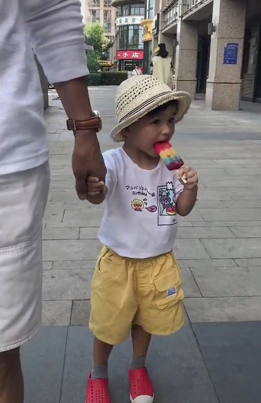 当天,李子雄牵着儿子的手逛街,他穿着一身白色休闲装,糖豆则穿着一件印着卡通图案的白T,搭配黄色短裤,头上戴着一顶草帽,一边走一边吃雪糕,穿着休闲又不失新潮,很是招人喜欢。