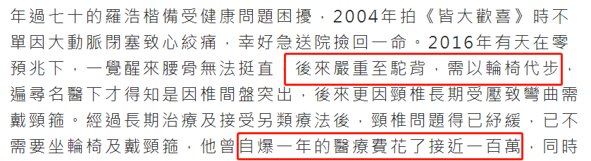 随着年岁渐长,罗浩楷身体出现了不少问题。2004年,他在拍摄《皆大欢喜》时心绞痛,幸好送院及时。
