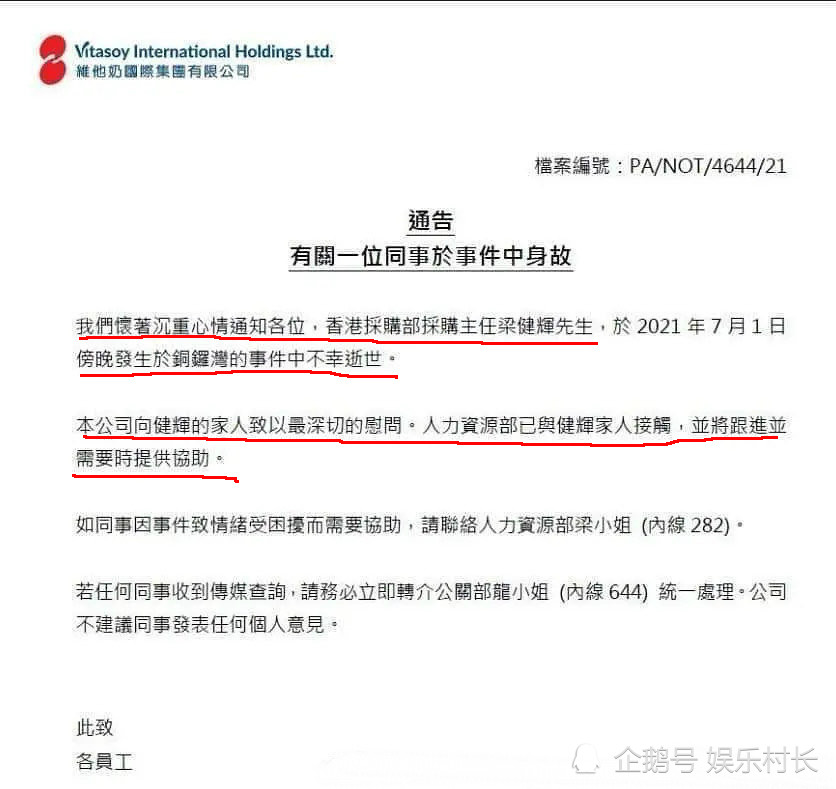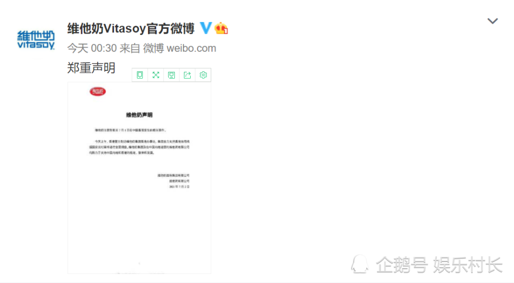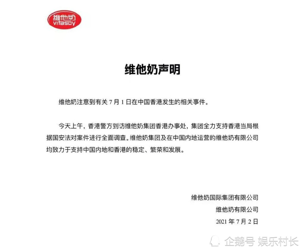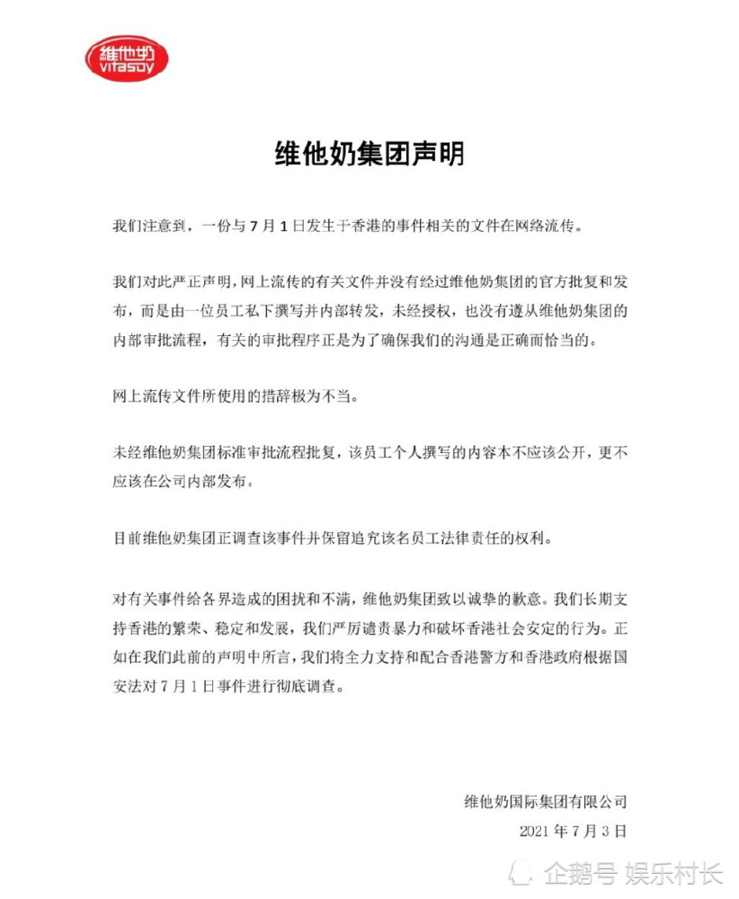 7月3日中午,维他奶集团再度发布声明回应网传公司内部的悼念文件,称集团官方从未批复和发布,而是一位员工私下撰写并内部转发,未经授权,也没有遵从维他奶集团的内部审批流程。同时承认网传文件中使用的措辞极为不当,未经批复情况下该员工撰写内容不应发布。目前,公司保留对该员工追究法律责任的权利,最后则是维他奶品牌对此表示歉意等。