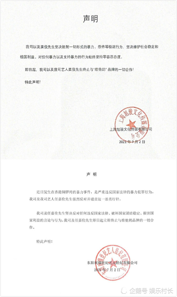 (首发)在娱乐圈内,每位明星身上都有多个品牌代言,不过在遇到品牌出现原则性的不当行为后,明星艺人都会紧急表态,基本都是解除合作的结果,之前国外奢侈品品牌出现辱华行为,杨幂、迪丽热巴、王俊凯、黄轩等人都曾宣布解约。如今,维他奶品牌出现原则性的不当行为,代言人龚俊和任嘉伦纷纷宣布解约,受到网友及粉丝称赞。