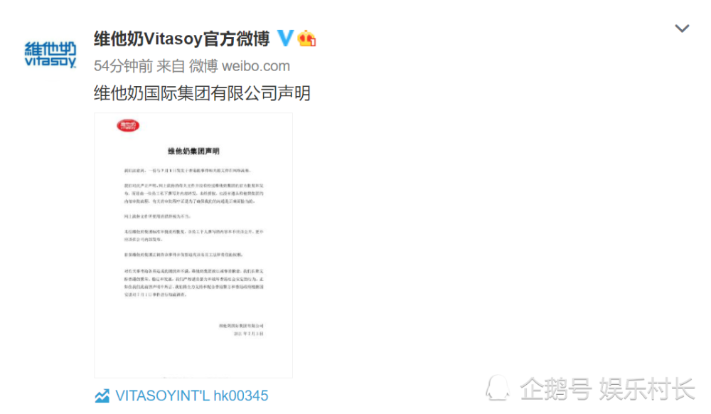 在龚俊与任嘉伦宣布与维他奶解约后,此事舆论在网络持续发酵,维他奶也遭到消费者的抵制,对于此喂奶他品牌迅速发布声明回应。首先,在7月3日零点左右,维他奶声明回应此事,表示坚决配合及支持警方对此事全面调查,同时表明公司的态度。其实,关于消费者抵制维他奶及龚俊任嘉伦解约的很大原因是维他奶内部的那份悼念文件,对于此公司同样进行了回应。
