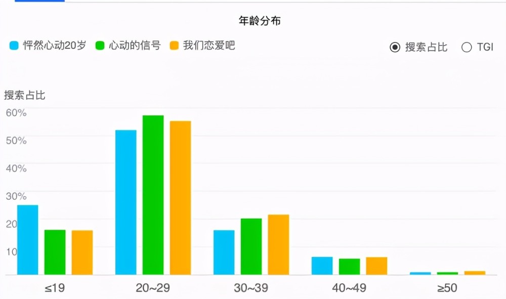 百度指数也有类似的数据结果。相比于《心动的信号》和《我们恋爱吧》这类偏重职场人群的恋综,《怦然心动20岁》在19岁及以下的搜索人群占比超过25%,明显高于另外两档,而在其他年龄层的受众,也明显少于另外两档。