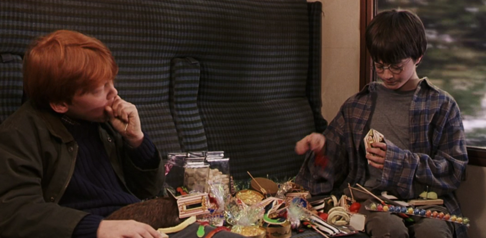 当然,像罗恩这样的穷人是无法体会火车上买零食的快乐的。但他遇到了“有钱人”哈利,一出手就是买下整车的零食,不用自己掏钱,罗恩吃得倍儿起劲。