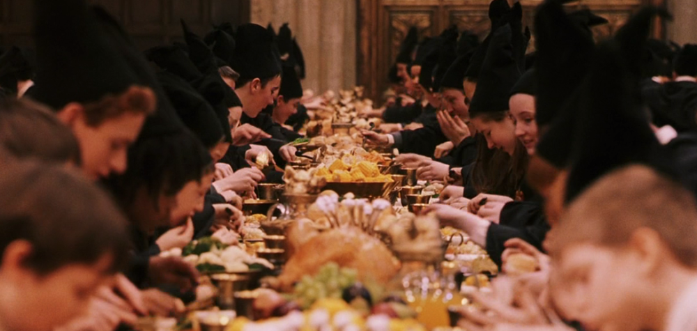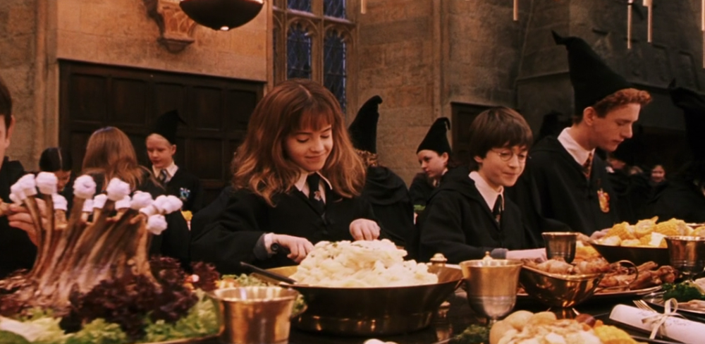 霍格沃茨每年的开学宴都是一场美食盛宴。虽然几乎每一部电影都着重拍摄了这场戏,但最令人印象深刻的,必须是第一部《魔法石》的开学宴。