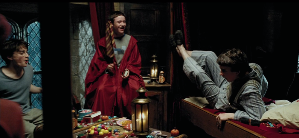 电影中少有展现哈利与其他同学互动的镜头,尤其是在课堂之外。但在《阿兹卡班的囚徒》中,我们不仅看到男生宿舍们嬉笑打闹的情景,还意外发现,原来这帮顽皮的少年们也是零食爱好者啊。