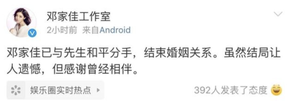 虽说,事业在上升中,但邓家佳的感情生活却有些不顺。两年前邓家佳突然官宣与老公离婚,惊倒了一众网友,不少网友甚至还不知道她已经结婚了,就看到了她官宣离婚的消息。