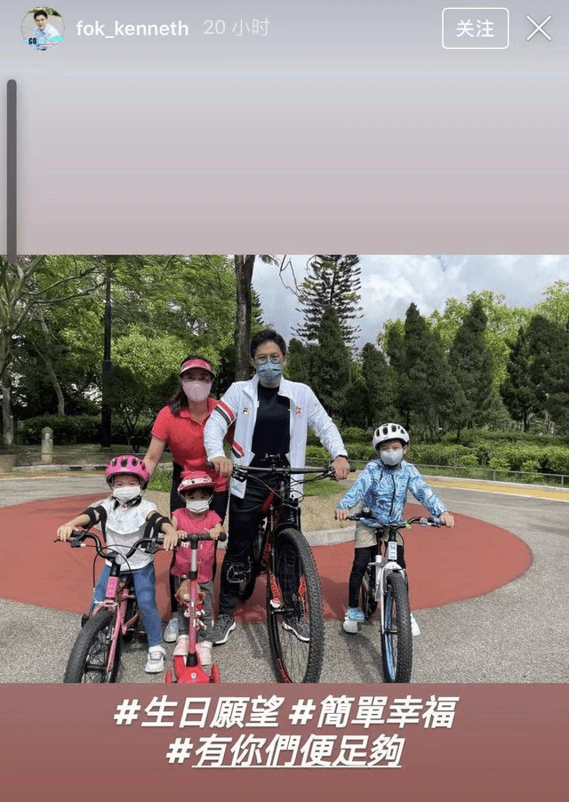 7月2日,是霍启刚42岁的生日,他在社交账号上晒出一家五口一起骑单车的合影,并配文称“生日愿望:简单幸福,有你们便足够”。