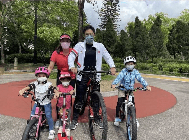 照片中,霍启刚和家人一起到公园骑单车。霍启刚身穿黑色的运动装,搭配白色休闲外套,看起来年轻有活力。
