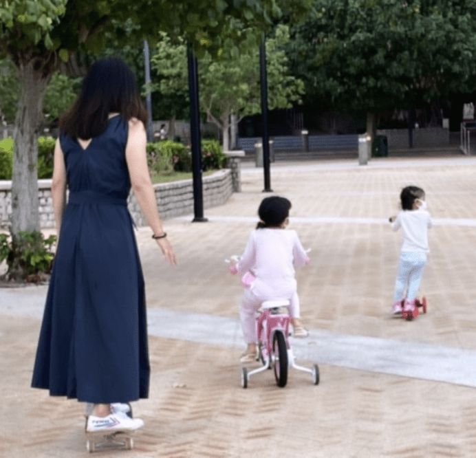 三个孩子戴着头盔、一人骑一辆小自行车伴随在爸爸妈妈身边,儿子霍中曦和二女儿霍中妍骑着单车,而三胎女儿霍中怡乖巧地站在滑板车上,看着很可爱,妈妈郭晶晶则贴心扶着孩子们,怕他们摔倒。不得不说,他们家这样的庆生方式还是蛮独特的,既锻炼了身体,又增强了亲子感情。