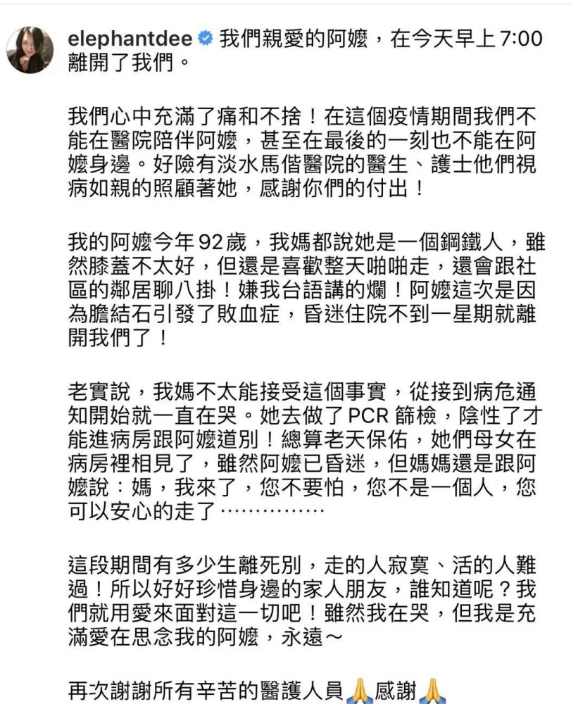 字里行间可以看出小S的哀伤,正如她所言,家人心里都充满了悲痛与不舍,但外婆92岁离世,而且因为昏迷没有受到病痛折磨,对家人来说,这是值得安慰的。