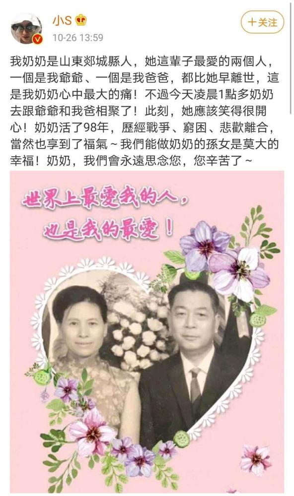 小S公开了一张母亲与外婆的合照,并发长文痛别外婆。