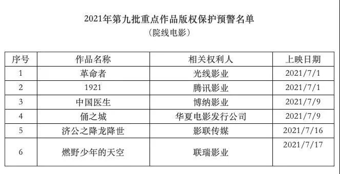 2、国家版权局公布2021年度第九批重点作品版权保护预警名单