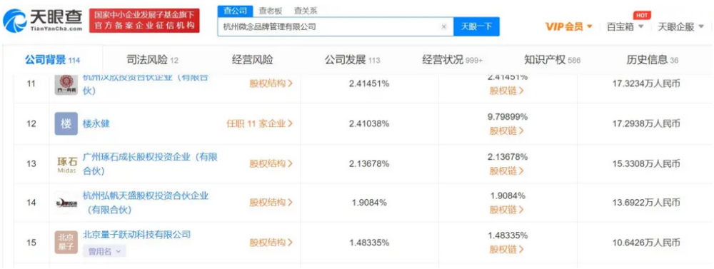天眼查显示,李子柒签约公司杭州微念品牌管理有限公司发生工商变更,新增字节跳动关联公司北京量子跃动科技有限公司为股东,持股比例为1.48335%。同时,公司注册资本由约704.05万人民币增加至约717.47万人民币。