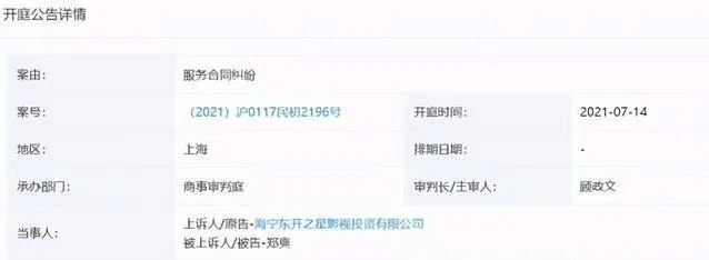 日前,有开庭公告信息显示,海宁东开之星影视投资有限公司与郑爽服务合同纠纷的案件将于7月14日再次开庭。据悉,早在3月23日,本案就已经第一次开庭,当时郑爽因在美国处理与张恒的抚养权案而未能到现场。《翡翠恋人》2016年1月开拍,但一直未能播出。