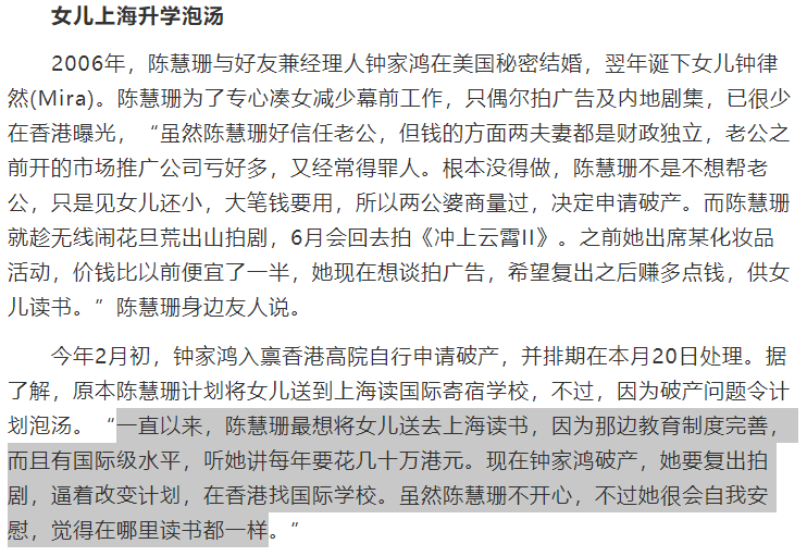 要知道,陈慧珊本来打算送爱女就读上海国际学校,如今家庭资金紧张,她宁愿勒紧裤腰带,换楼买车,咬紧牙关送女儿读了香港的国际学校。