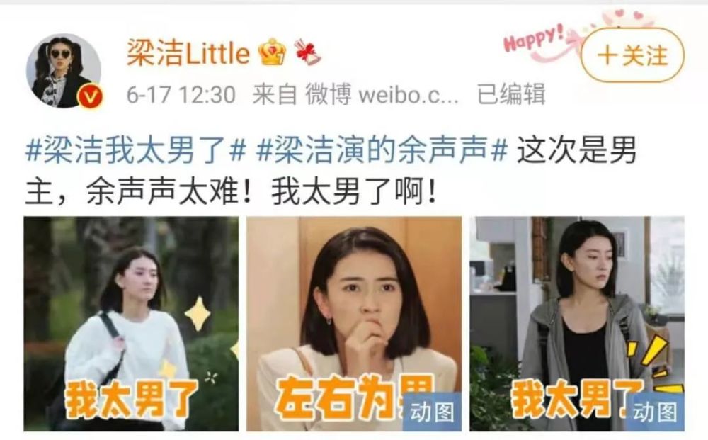 而梁洁这边,虽然女演男的反差,没有男演女的反差那么明显,但她也很好地hold住了男女版余声声的不同。