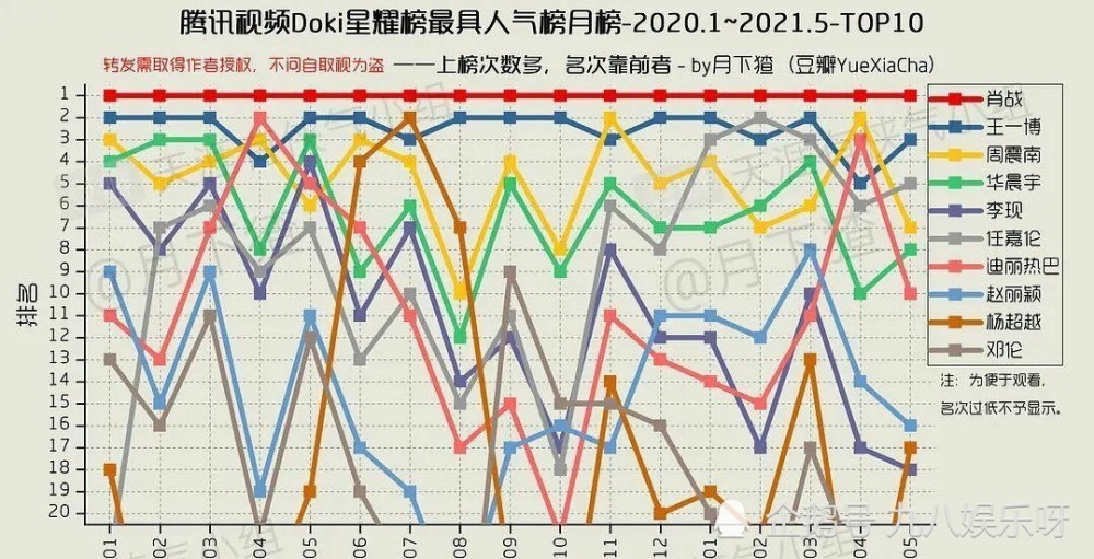 榜单上每一种艺人都用不同的颜色标出曲线,在榜单上能够看出每一位艺人的曲线都或多或少的有一些波动。