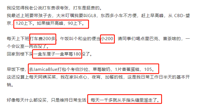 “打车200多,午饭小200,车厘子草莓180,早餐105,每天一千多”