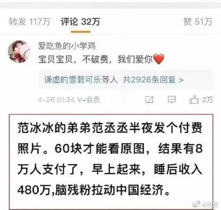 范冰冰的弟弟范丞丞半夜发了个付费照片,60元看原图,8万人支付。