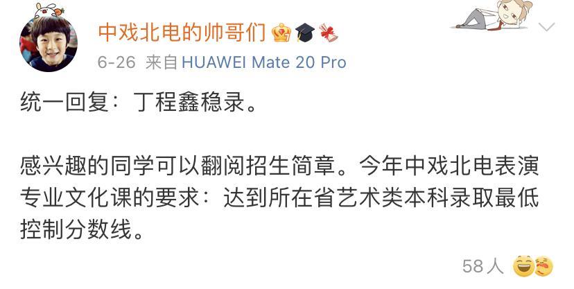 《快乐大本营》主持人是一个非常好的身份,丁程鑫作为TF家族的二代练习生,跟着TFBOYS一起长大,经历了非常多的心酸时刻,现在也是苦尽甘来了,小丁大学报考的是北电的表演系,虽然时代峰峻和他本人都没有官宣高考成绩,但已经有官方消息透露丁程鑫稳录北电。