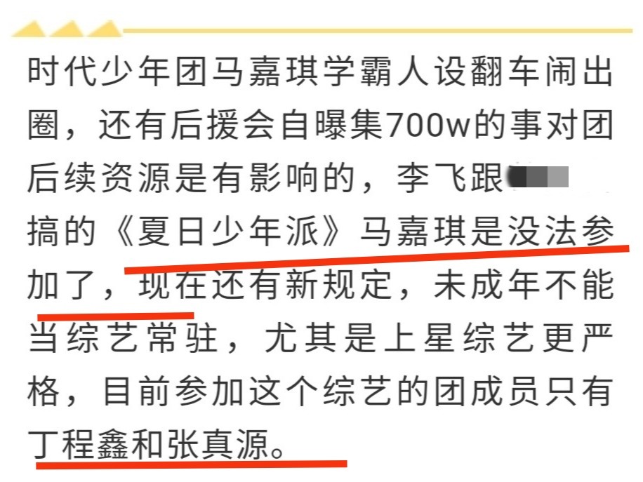 高考落榜加上集资700万的消息,致使有时代少年团成员参加的新综艺《夏日少年派》,只有丁程鑫和张真源两人,除了马嘉祺,其他成员都是因为年龄问题而不能参加。