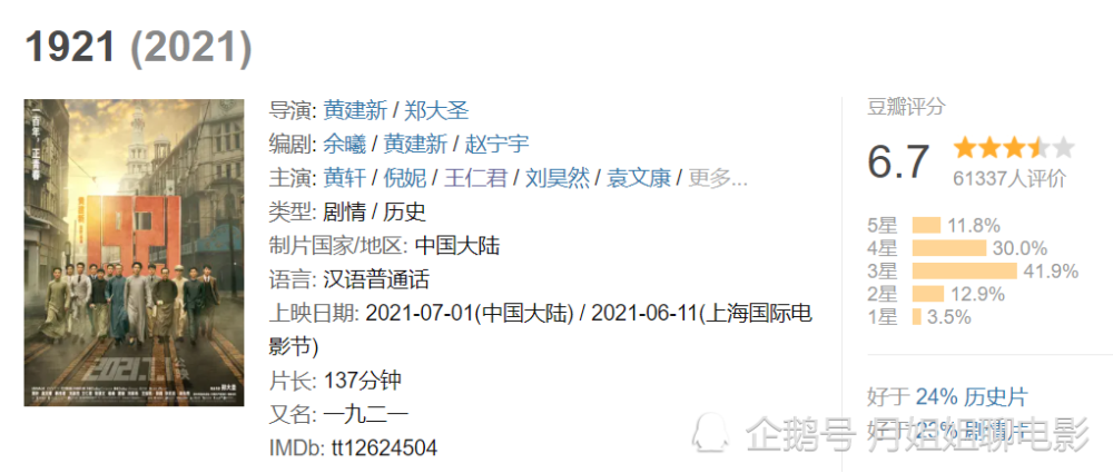 《1921》这部电影的口碑其实也还不错,但剧情的分线较多,从而让主线并不是很明朗,从而影响了整部电影的剧情发展,演员们的演技均在线。