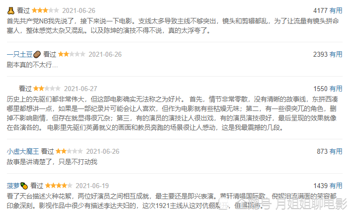 《革命者》和《1921》的口碑差距较为明显,豆瓣评分虽然并不能说明电影的质量差距,但实际上确实《革命者》获得了更好的口碑。