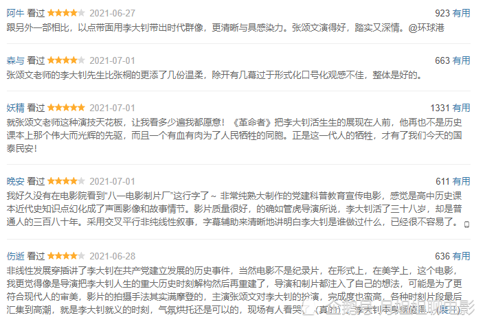 《革命者》的好口碑建立在电影的剧情更加流畅,张颂文出演的李大钊更加具有时代感,而且剧本相对来说更加完整。