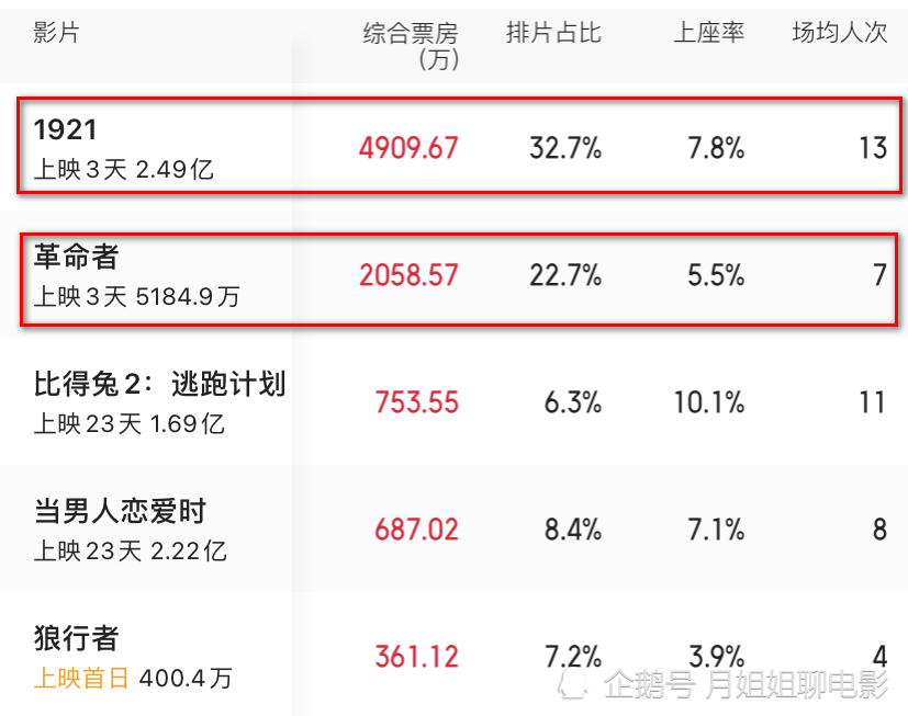 这主要是因为热度上的差距导致。《革命者》的排片量仅为22.7%,而《1921》的排片量为32.7%,两部电影的宣传都不多,《1921》进行了为期三天的点映,大获全胜,这也间接奠定了票房成绩的优势。
