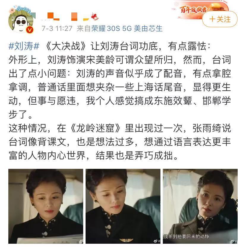 这位网友认为刘涛企图在语言表现上去呈现大家认为的宋美龄,结果有点东施效颦,有点做作,不够那么自然或流畅,显得底气不足,缺乏自信。